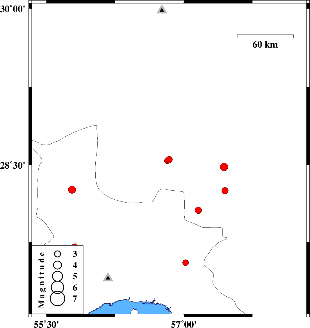 | 2009/07/19 | 07:51:10.8 | 12:21:10.8 | 27.55 | 57.02 | 14 | ML:3 | Hormozgan Province, 26 km North-West of Dehbarez | ||