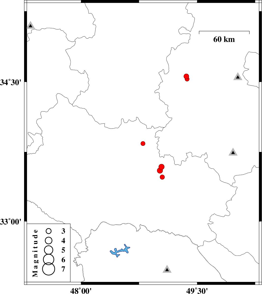 | 2009/07/25 | 20:37:33.1 | 01:07:33.1 | 33.59 | 49.04 | 15 | ML:3.2 | Lorestan Province, 12 km North of Dorud | ||