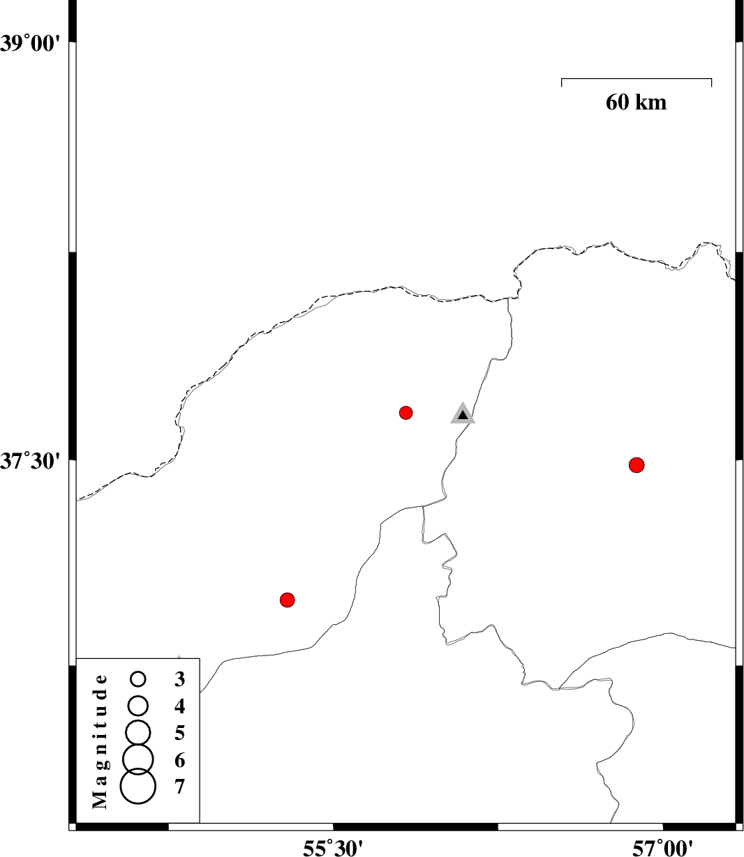 | 2009/06/30 | 10:09:20.3 | 14:39:20.3 | 37.48 | 56.88 | 28 | ML:3.1 | 9 km Ashkhaneh, Khorasan(north) Province | ||