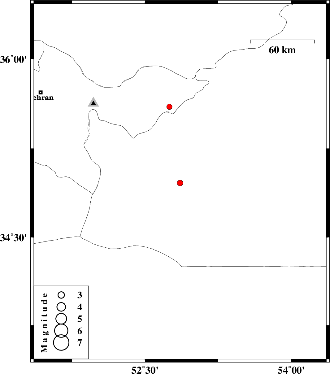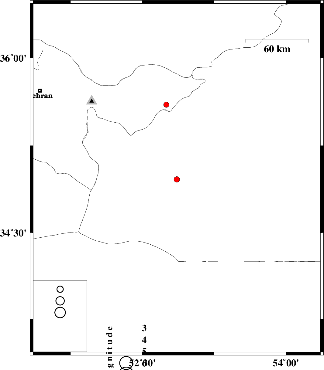 | 2009/08/05 | 08:02:26.6 | 12:32:26.6 | 34.96 | 52.86 | 27 | ML:2.7 | Semnan Province, 55 km South-East of Garmsar | ||