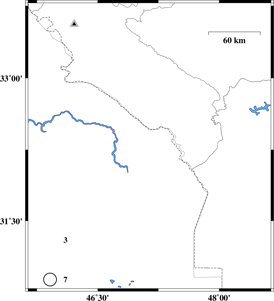 | 2009/08/05 | 23:13:29.7 | 03:43:29.7 | 32.27 | 47.18 | 14 | ML:3.4 | Iraq, 48 km South of Dehloran | ||