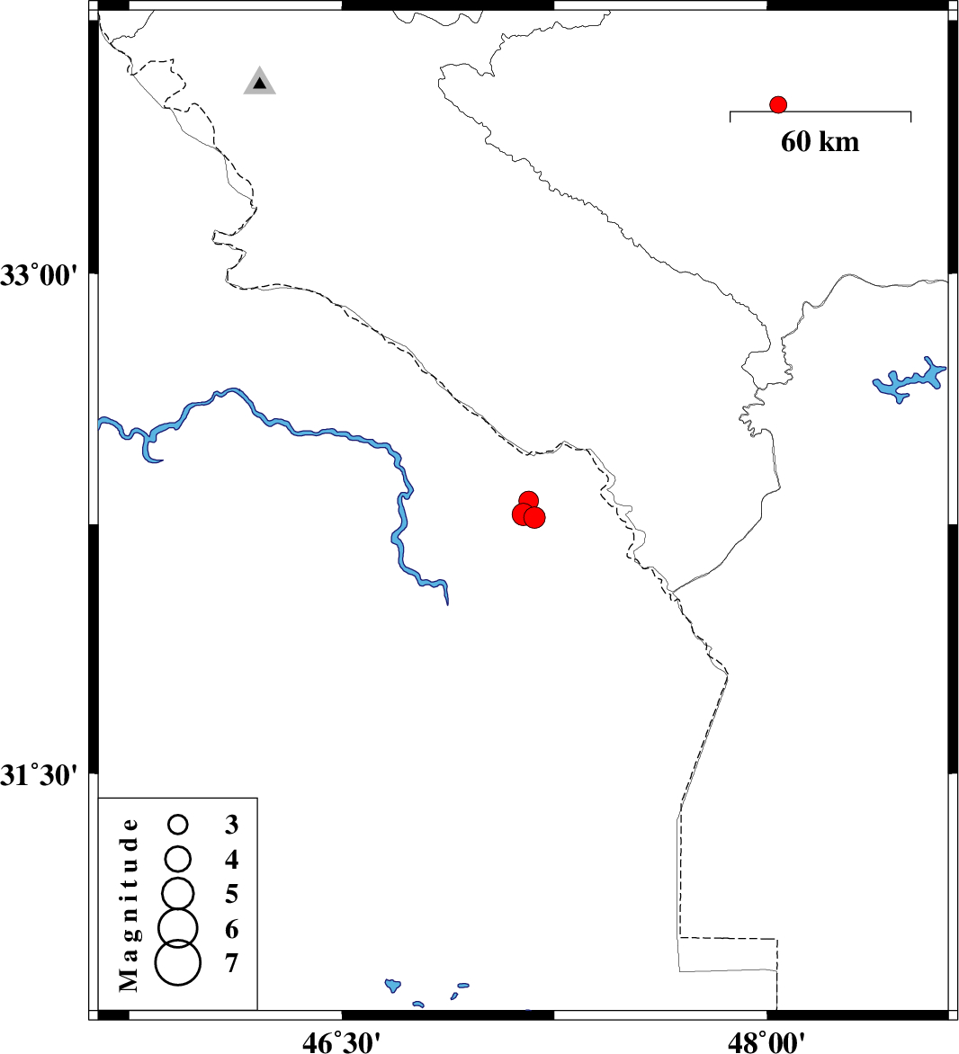| 2009/08/05 | 22:55:40.5 | 03:25:40.5 | 32.28 | 47.14 | 16 | ML:3.5 | Iraq, 47 km South-West of Dehloran | ||