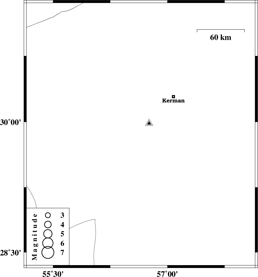 | 2009/08/06 | 23:39:35.2 | 04:09:35.2 | 29.85 | 56.65 | 6 | ML:3.3 | Kerman Province, 11 km Bardsir |