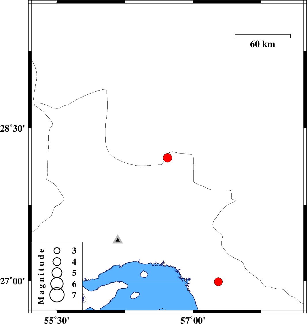 | 2009/08/07 | 18:59:33.9 | 23:29:33.9 | 26.99 | 57.28 | 18 | ML:4.1 | Hormozgan Province, 27 km South-East of Minab | ||