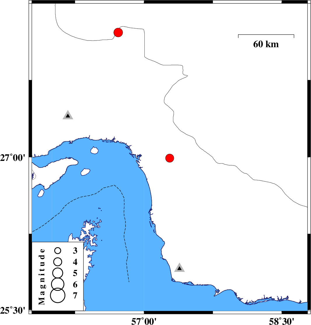 | 2009/08/07 | 18:59:33.9 | 23:29:33.9 | 26.99 | 57.28 | 18 | ML:4.1 | Hormozgan Province, 27 km South-East of Minab | ||