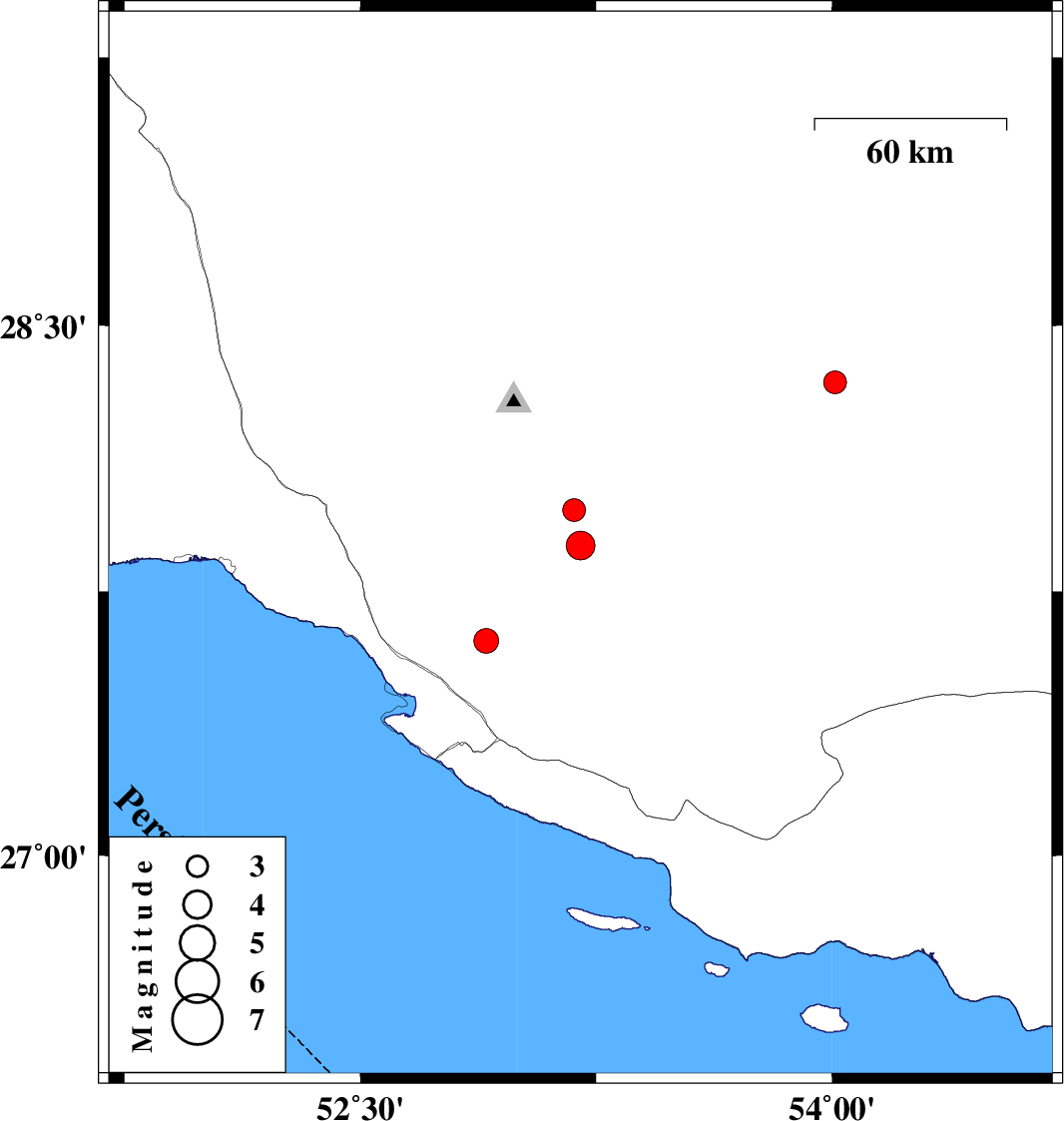 | 2009/08/08 | 06:36:44.8 | 11:06:44.8 | 27.61 | 52.9 | 23 | ML:3.5 | Fars Province, 7 km Mehr |