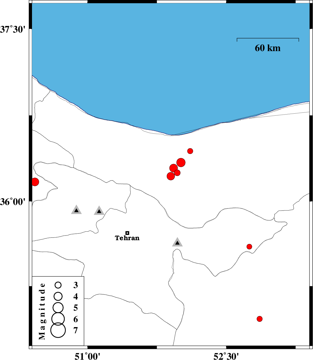 | 2009/08/05 | 08:02:26.6 | 12:32:26.6 | 34.96 | 52.86 | 27 | ML:2.7 | Semnan Province, 55 km South-East of Garmsar | ||