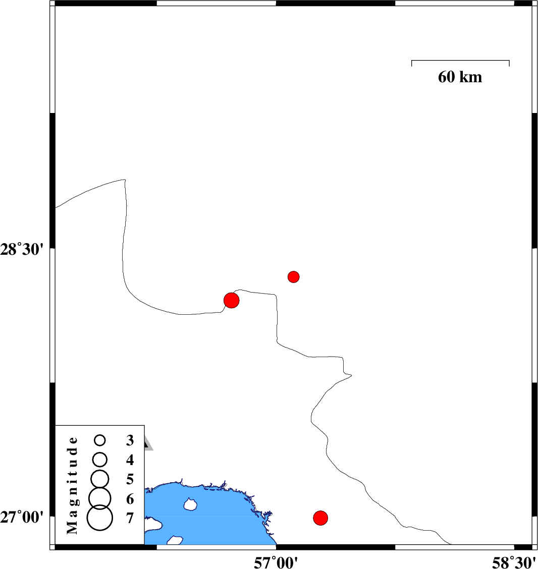 | 2009/08/07 | 18:59:33.9 | 23:29:33.9 | 26.99 | 57.28 | 18 | ML:4.1 | Hormozgan Province, 27 km South-East of Minab | ||
