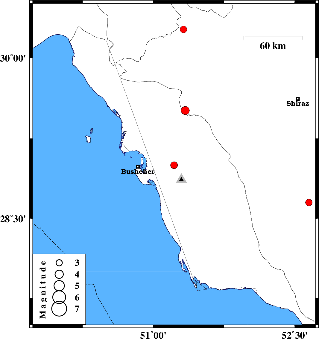 | 2009/08/15 | 01:46:42.6 | 06:16:42.6 | 29 | 51.22 | 15 | ML:3.4 | Bushehr Province, 14 km North of Ahram | ||