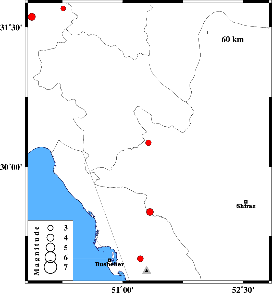 | 2009/08/15 | 01:46:42.6 | 06:16:42.6 | 29 | 51.22 | 15 | ML:3.4 | Bushehr Province, 14 km North of Ahram | ||
