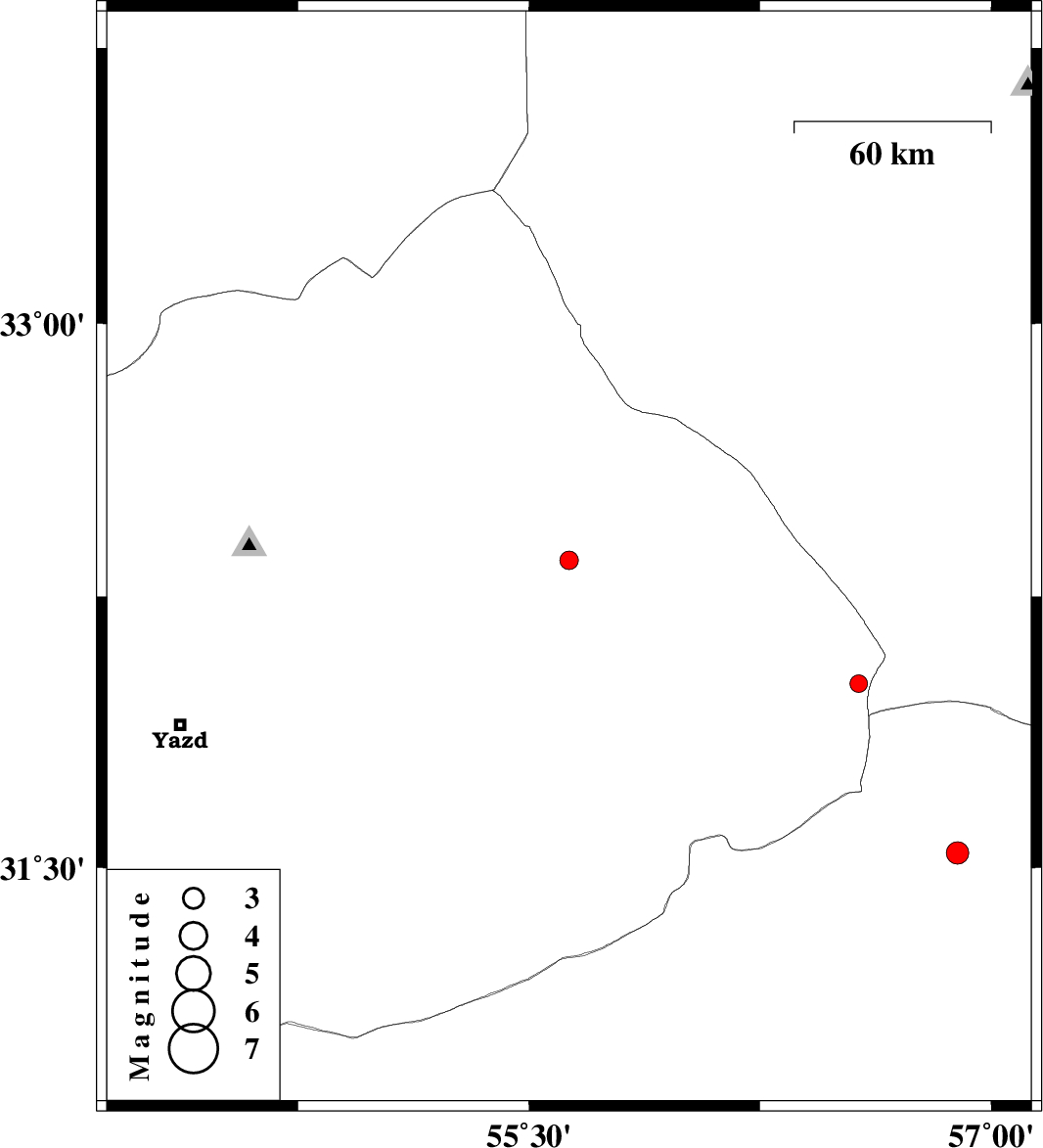 | 2009/08/16 | 08:56:18.3 | 13:26:18.3 | 32.35 | 55.63 | 14 | ML:2.7 | Yazd Province, 86 km North-East of Bafq | ||