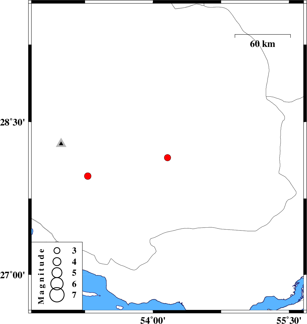 | 2009/08/12 | 07:18:23.1 | 11:48:23.1 | 27.97 | 53.28 | 14 | ML:3.4 | Fars Province, 60 km South-East of Qir va Karzin |