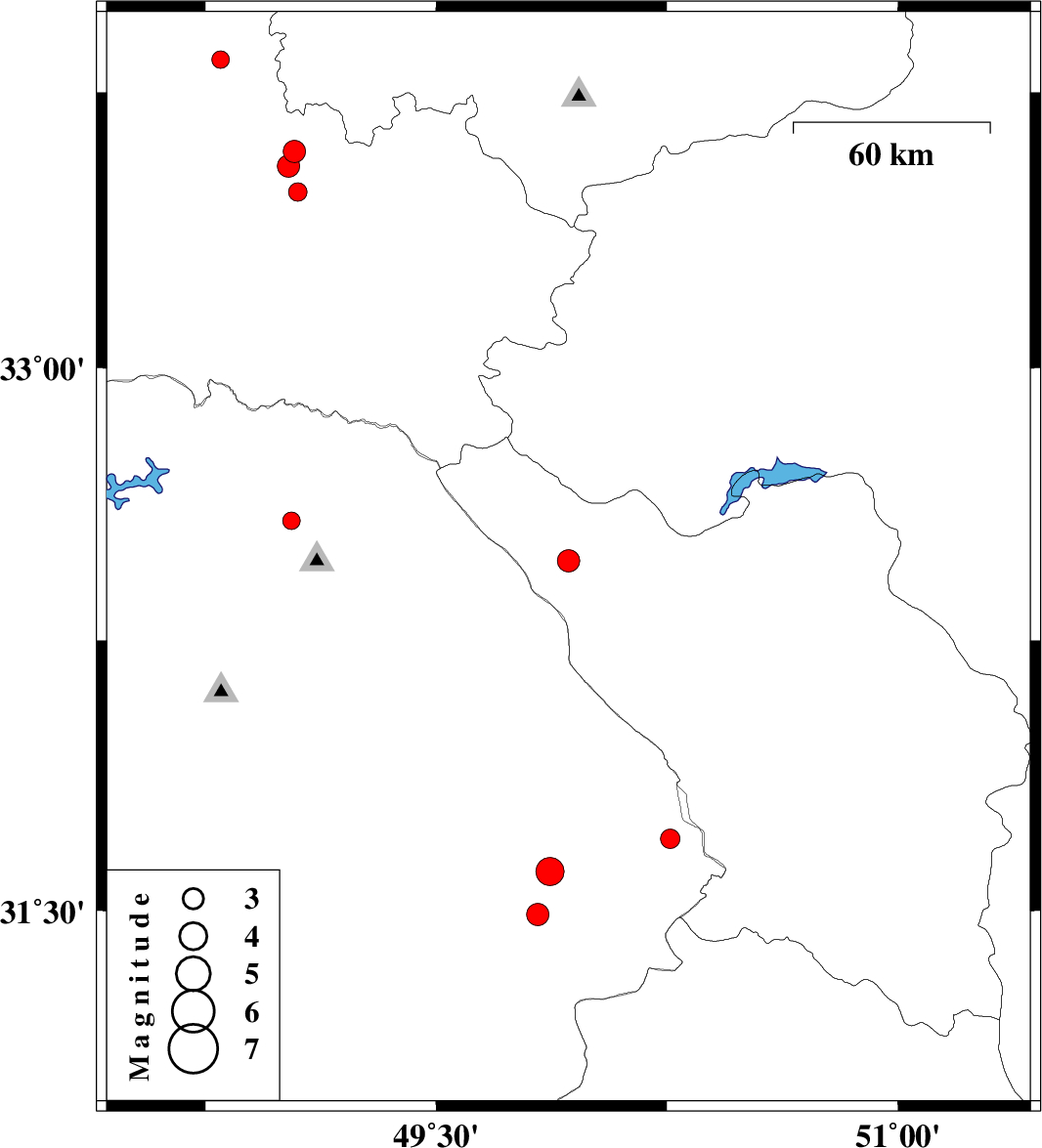 | 2009/08/20 | 12:46:42.0 | 17:16:42.0 | 32.47 | 49.93 | 15 | ML:3.3 | Chaharmahal Bakhtiari Province, 18 km West of Chelgard | ||