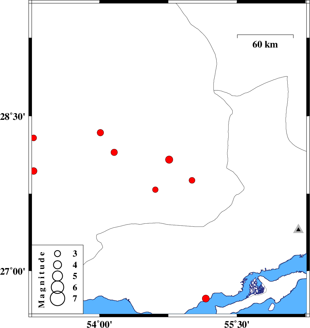 | 2009/08/06 | 07:36:36.1 | 12:06:36.1 | 27.88 | 55.01 | 14 | ML:3 | Fars Province, 70 km North-East of Lar | ||
