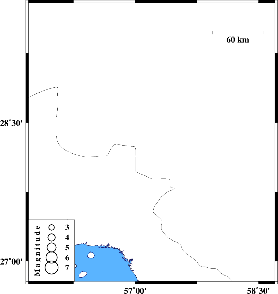 | 2009/08/22 | 19:17:18.9 | 23:47:18.9 | 28.28 | 57.2 | 14 | ML:3.5 | Kerman Province, 60 km North-West of Kahnuj |