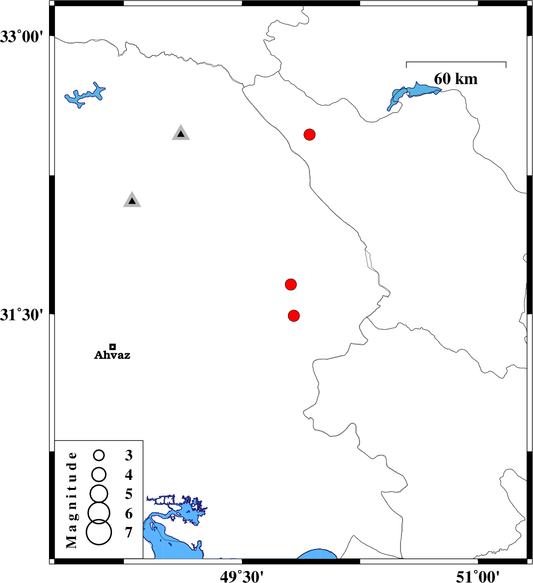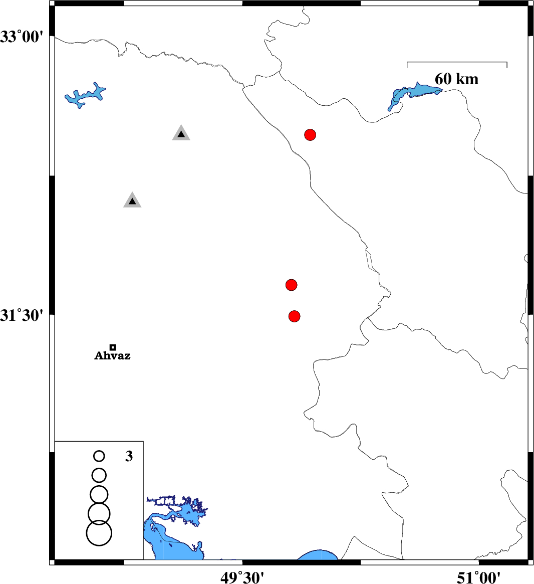 | 2009/08/20 | 12:46:42.0 | 17:16:42.0 | 32.47 | 49.93 | 15 | ML:3.3 | Chaharmahal Bakhtiari Province, 18 km West of Chelgard | ||