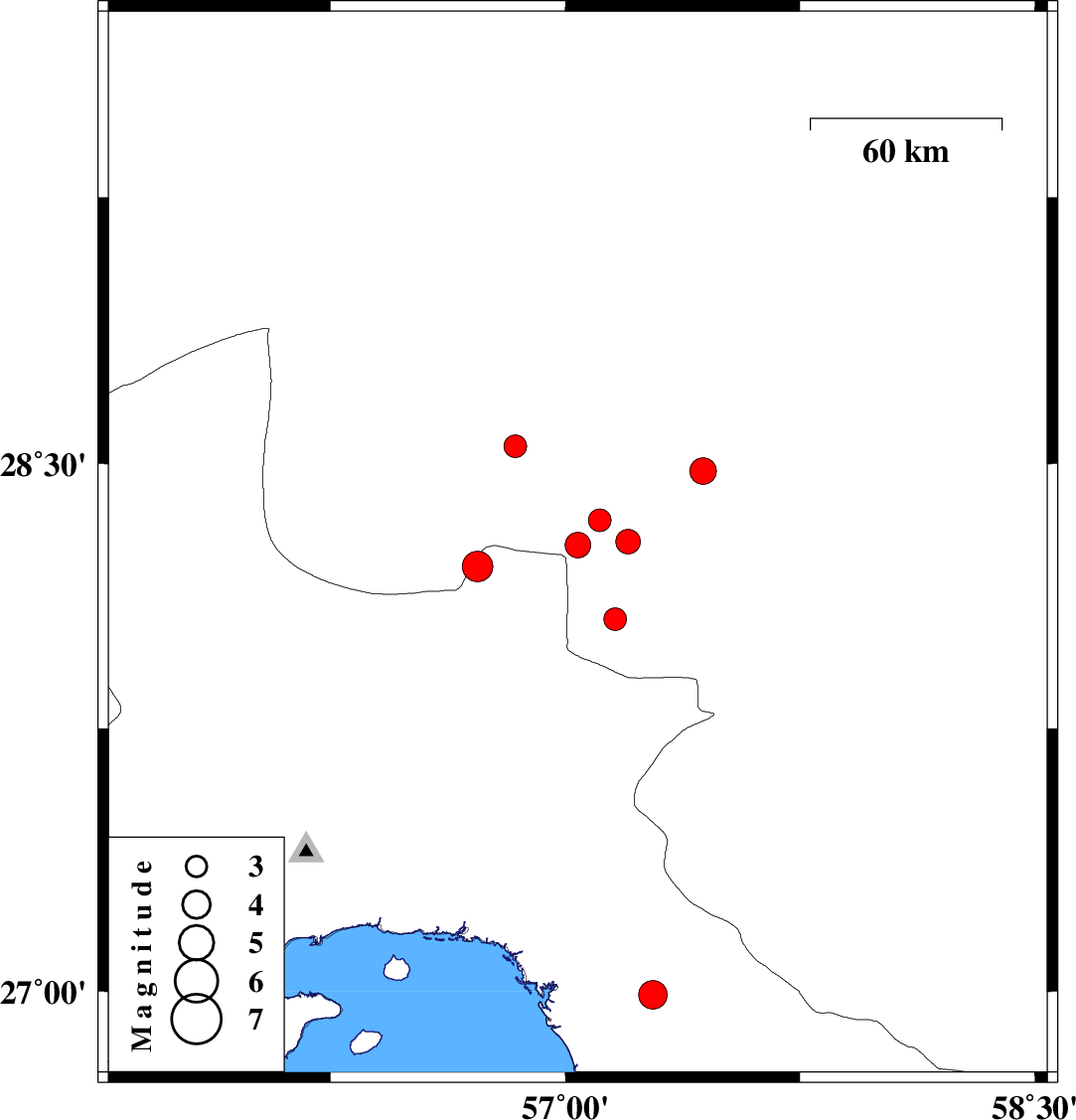 | 2009/08/24 | 13:44:28.5 | 18:14:28.5 | 28.27 | 57.04 | 15 | ML:3.7 | Kerman Province, 73 km North-West of Kahnuj | ||