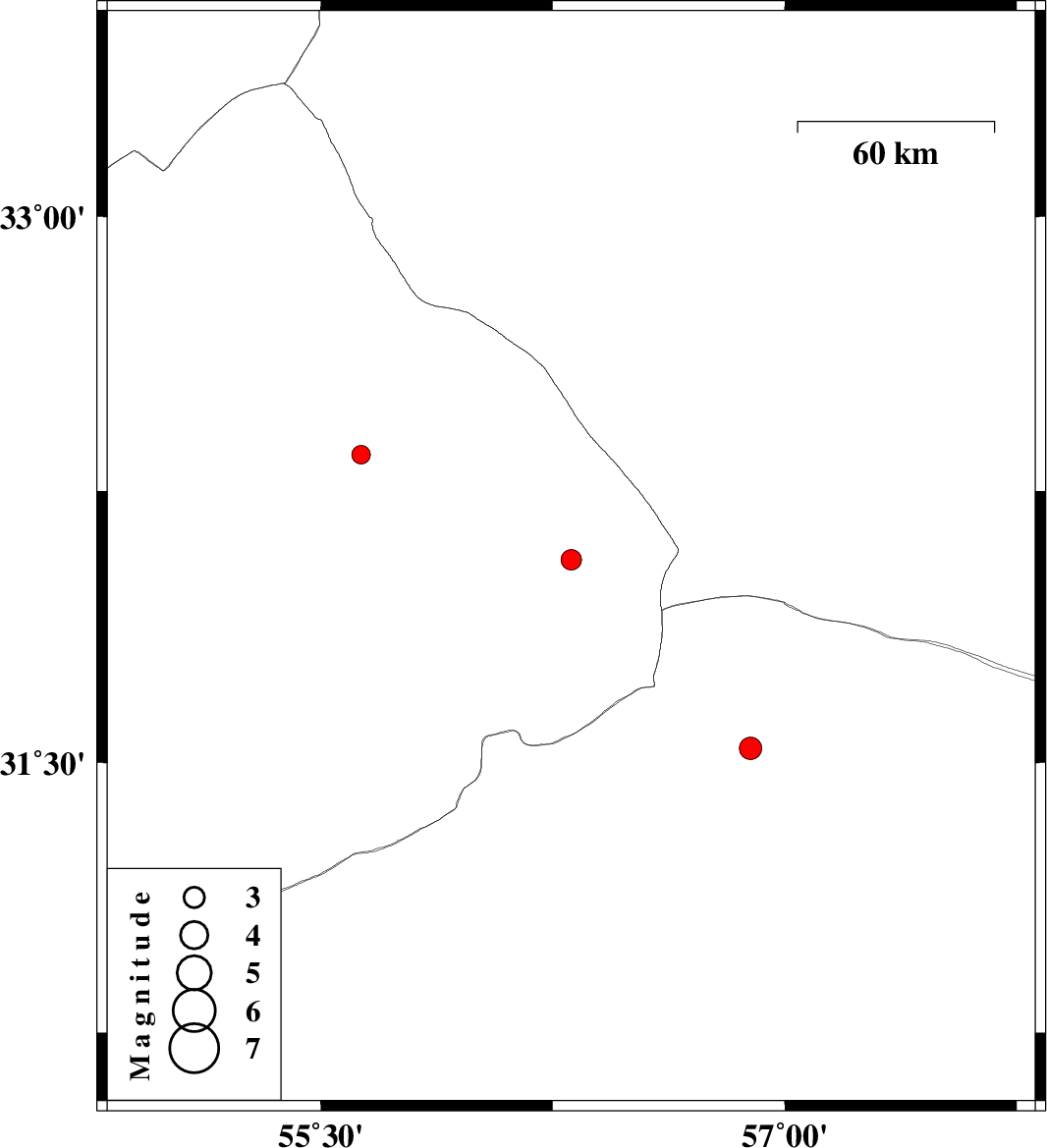 | 2009/08/09 | 16:22:59.7 | 20:52:59.7 | 31.54 | 56.89 | 18 | ML:3.3 | Kerman Province, 31 km North of Ravar |
