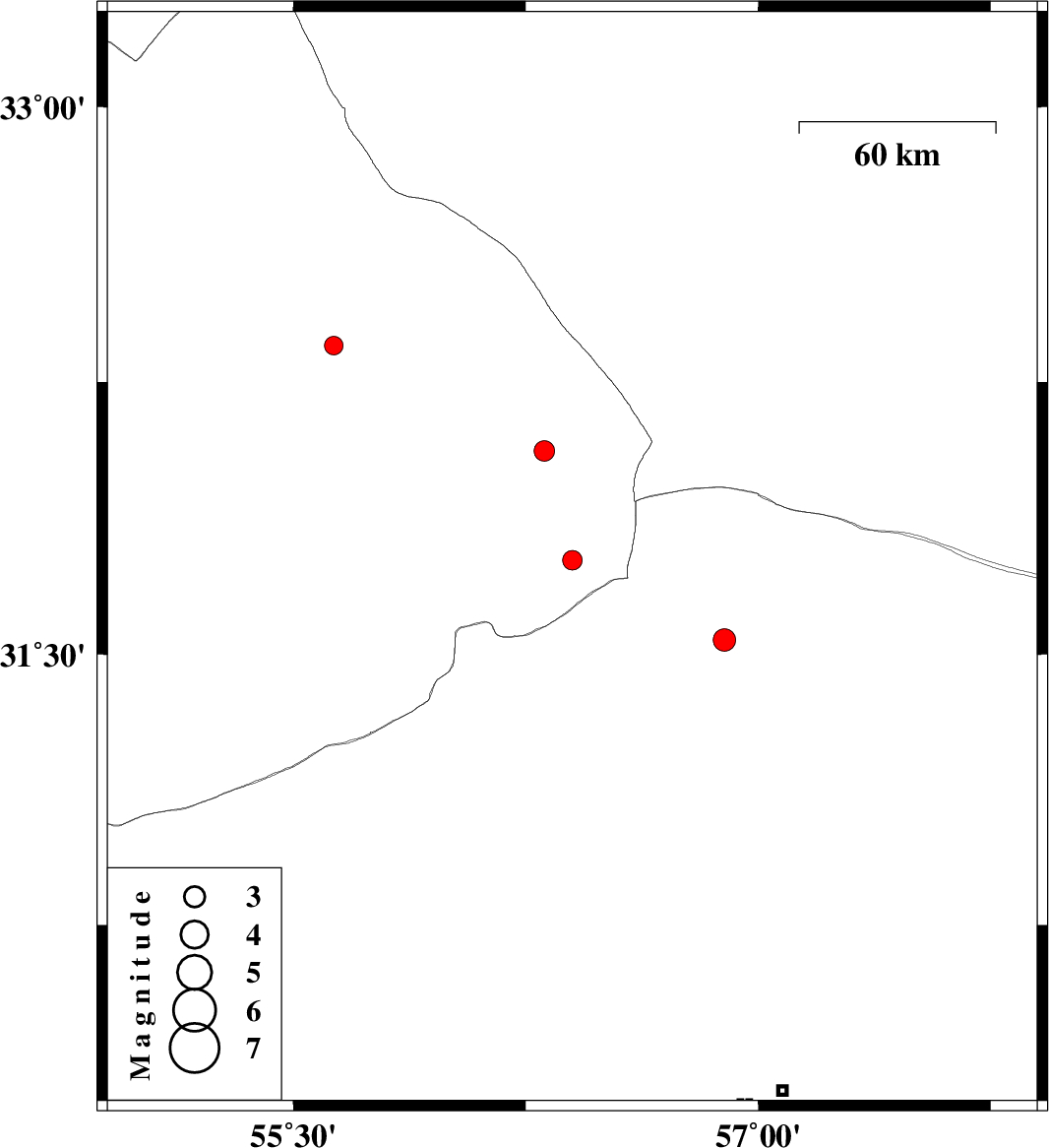 | 2009/08/09 | 16:22:59.7 | 20:52:59.7 | 31.54 | 56.89 | 18 | ML:3.3 | Kerman Province, 31 km North of Ravar |