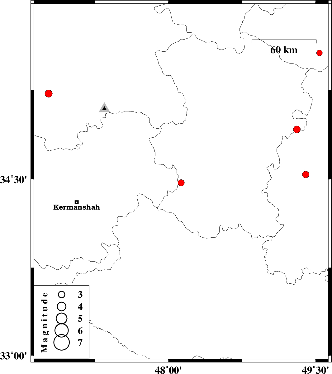 | 2009/08/30 | 09:08:33.8 | 13:38:33.8 | 33.45 | 46.92 | 14 | ML:3.2 | Ilam Province, 50 km South-East of Ilam | ||