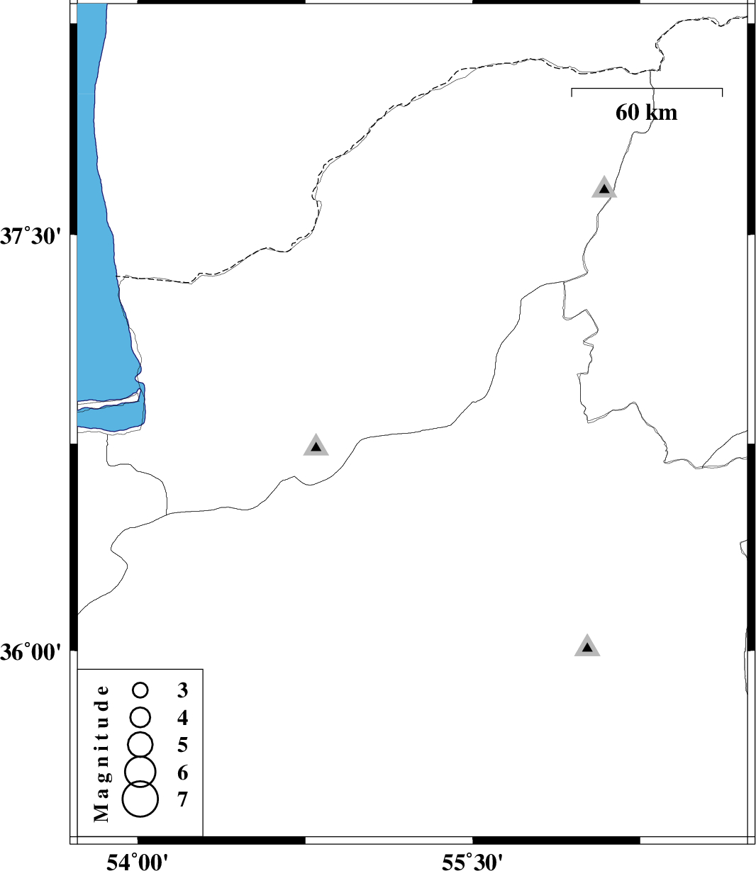 | 2009/08/07 | 07:27:34.0 | 11:57:34.0 | 36.82 | 55.23 | 14 | ML:3.5 | Golestan Province, 22 km South of Ramian |