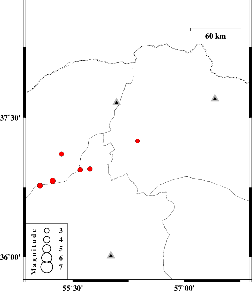| 2009/08/07 | 07:27:34.0 | 11:57:34.0 | 36.82 | 55.23 | 14 | ML:3.5 | Golestan Province, 22 km South of Ramian |
