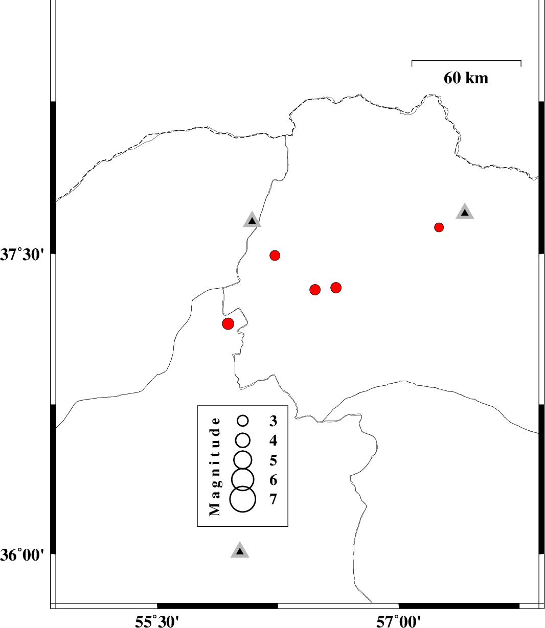 | 2009/08/20 | 23:19:20.9 | 03:49:20.9 | 36.95 | 55.73 | 6 | ML:2.9 | Semnan Province, 44 km South-East of Minodasht | ||