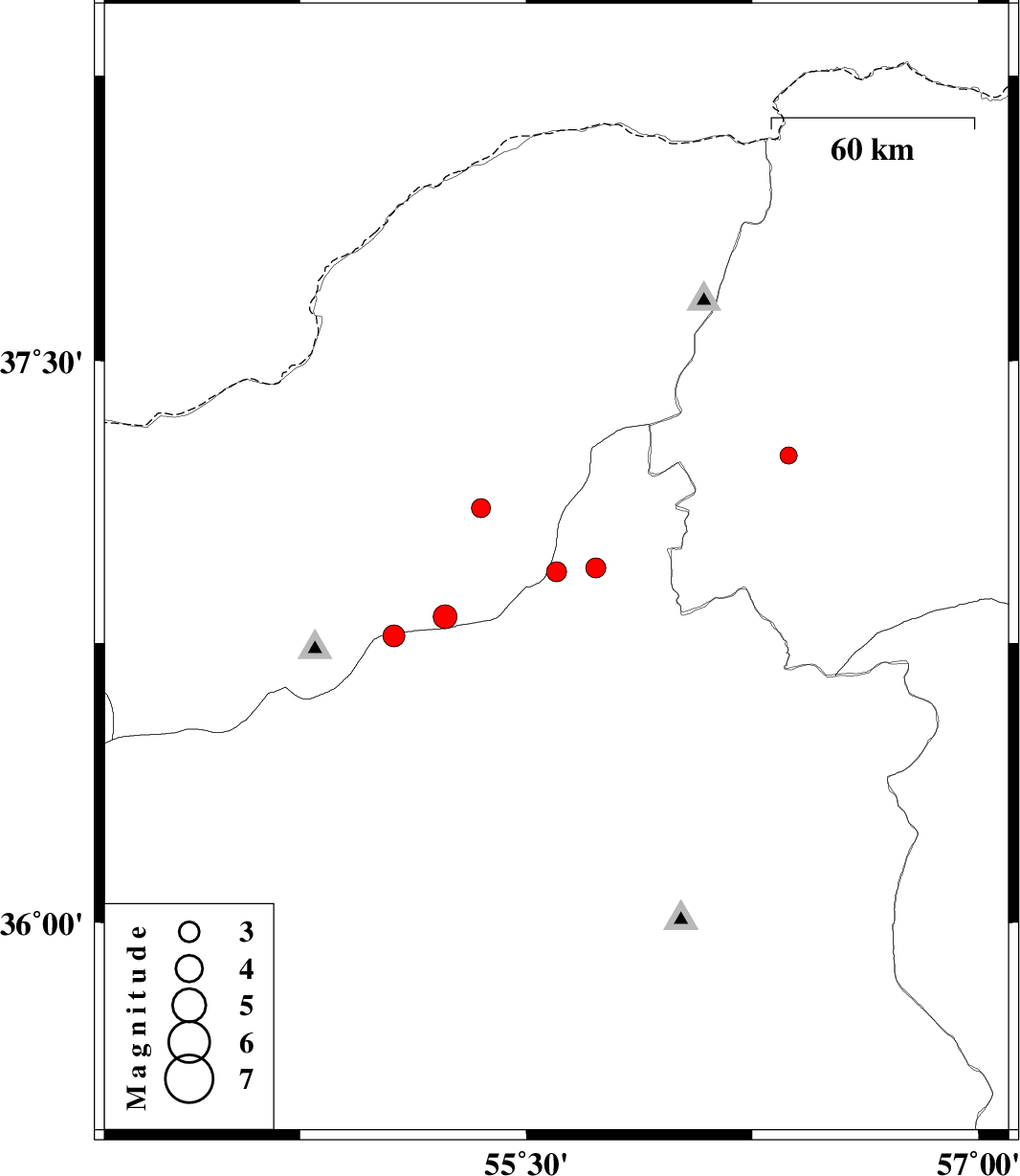 | 2009/08/07 | 07:27:34.0 | 11:57:34.0 | 36.82 | 55.23 | 14 | ML:3.5 | Golestan Province, 22 km South of Ramian |