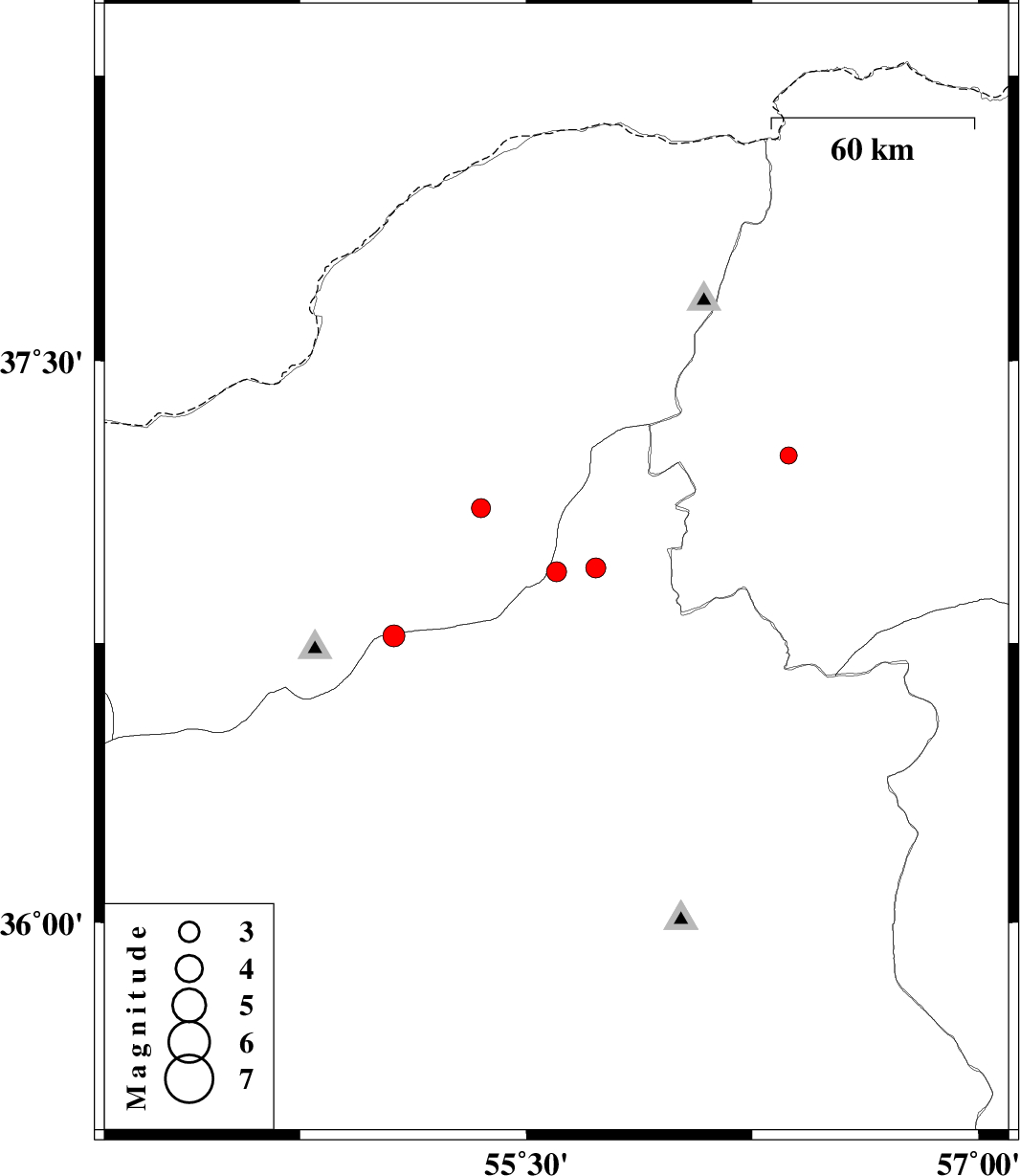 | 2009/08/13 | 04:59:32.1 | 09:29:32.1 | 37.11 | 55.35 | 7 | ML:2.8 | Golestan Province, 14 km South of Minodasht |