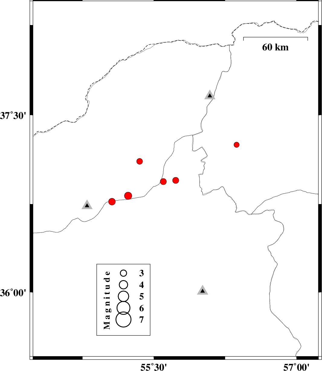 | 2009/08/07 | 07:27:34.0 | 11:57:34.0 | 36.82 | 55.23 | 14 | ML:3.5 | Golestan Province, 22 km South of Ramian |