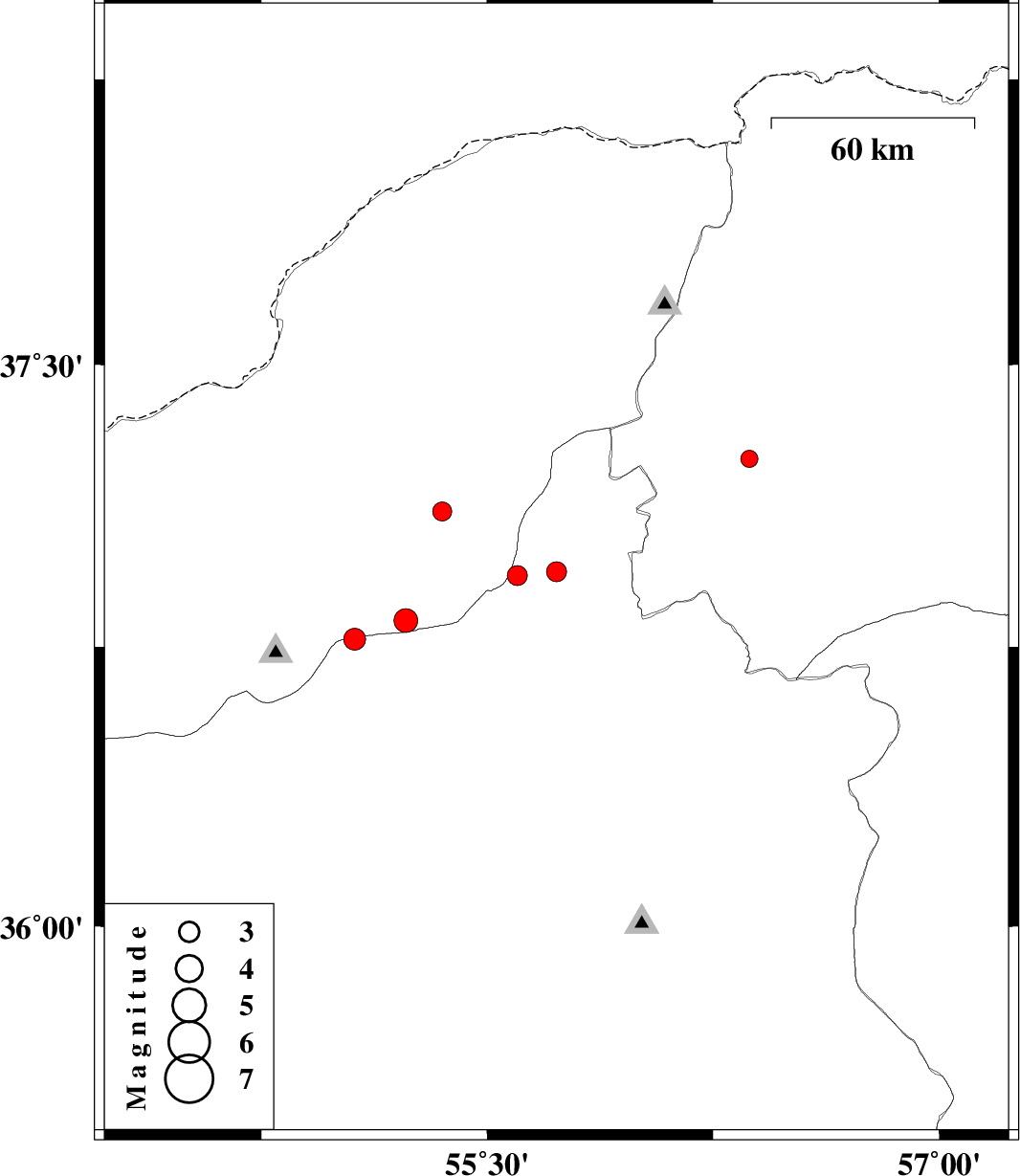 | 2009/08/20 | 23:19:20.9 | 03:49:20.9 | 36.95 | 55.73 | 6 | ML:2.9 | Semnan Province, 44 km South-East of Minodasht | ||