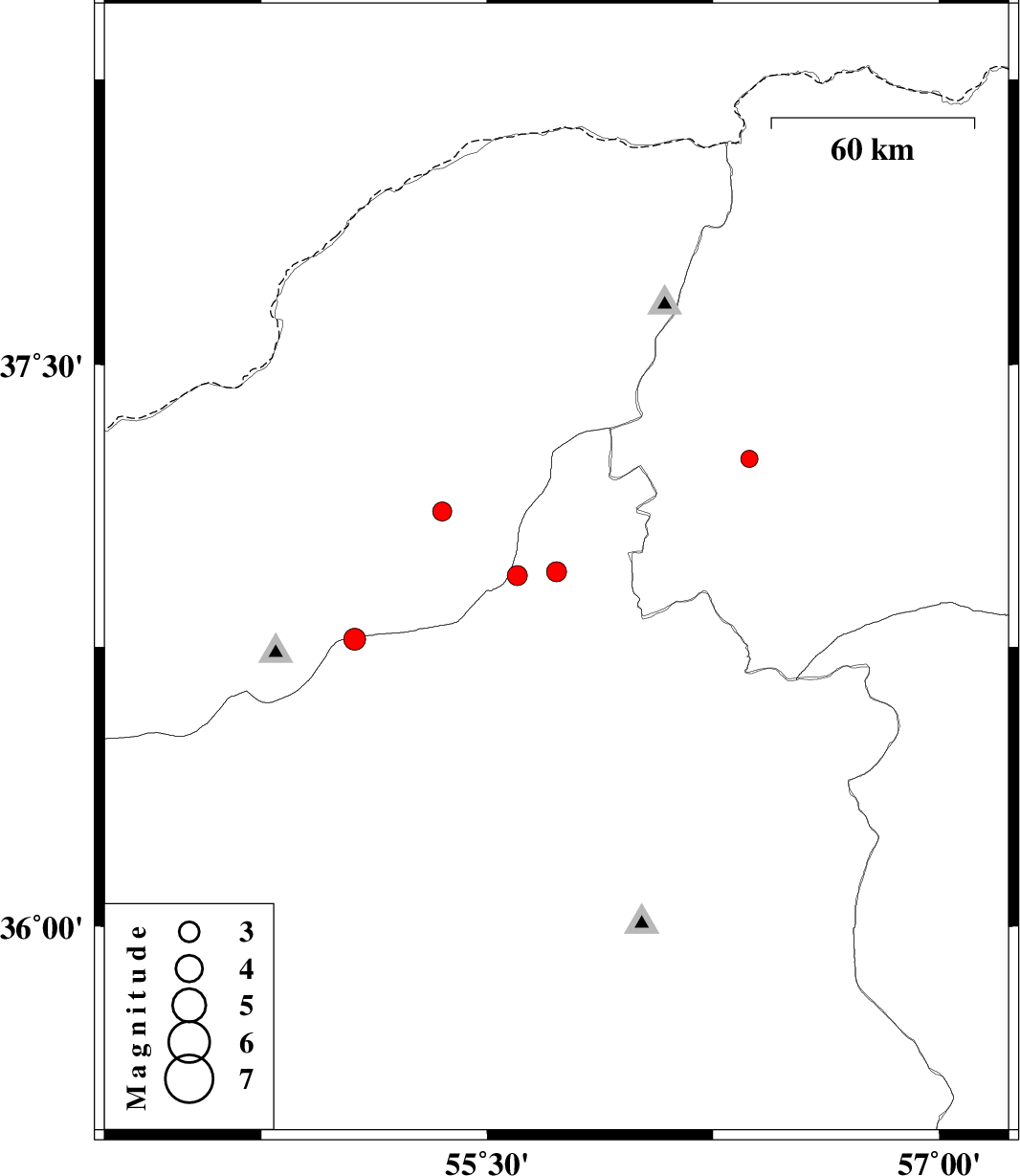 | 2009/08/13 | 04:59:32.1 | 09:29:32.1 | 37.11 | 55.35 | 7 | ML:2.8 | Golestan Province, 14 km South of Minodasht |