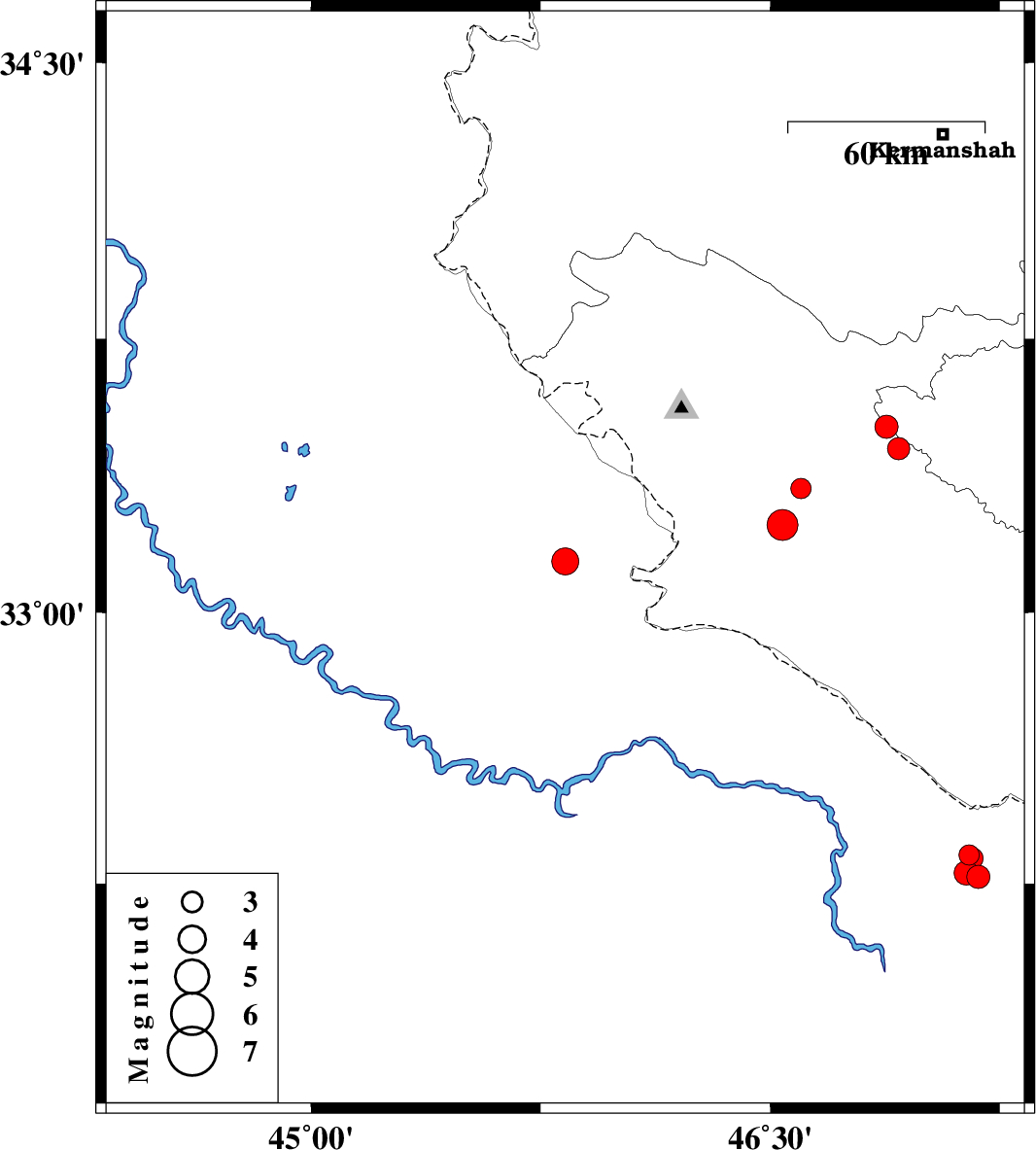 | 2009/08/30 | 09:08:33.8 | 13:38:33.8 | 33.45 | 46.92 | 14 | ML:3.2 | Ilam Province, 50 km South-East of Ilam | ||
