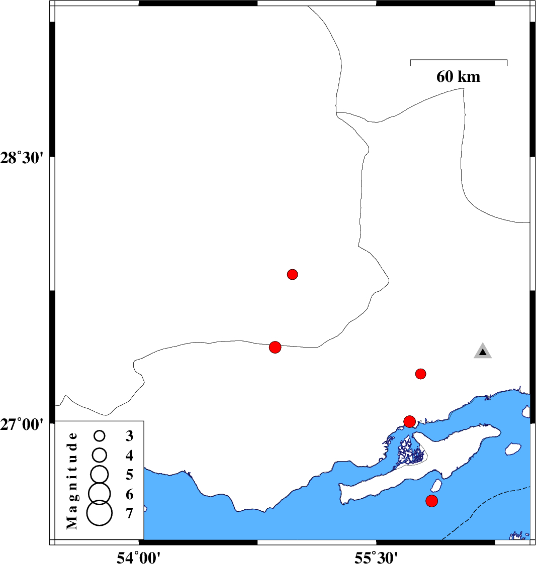 | 2009/08/26 | 11:25:30.0 | 15:55:30.0 | 27.43 | 54.86 | 14 | ML:3.4 | Hormozgan Province, 55 km North-East of Bastak |