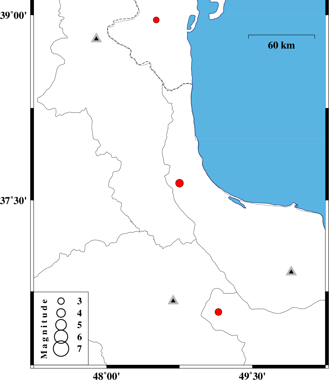 | 2009/09/11 | 18:09:42.3 | 22:39:42.3 | 37.64 | 48.75 | 15 | ML:3.6 | Gilan Province, 20 km East of Khalkhal | ||