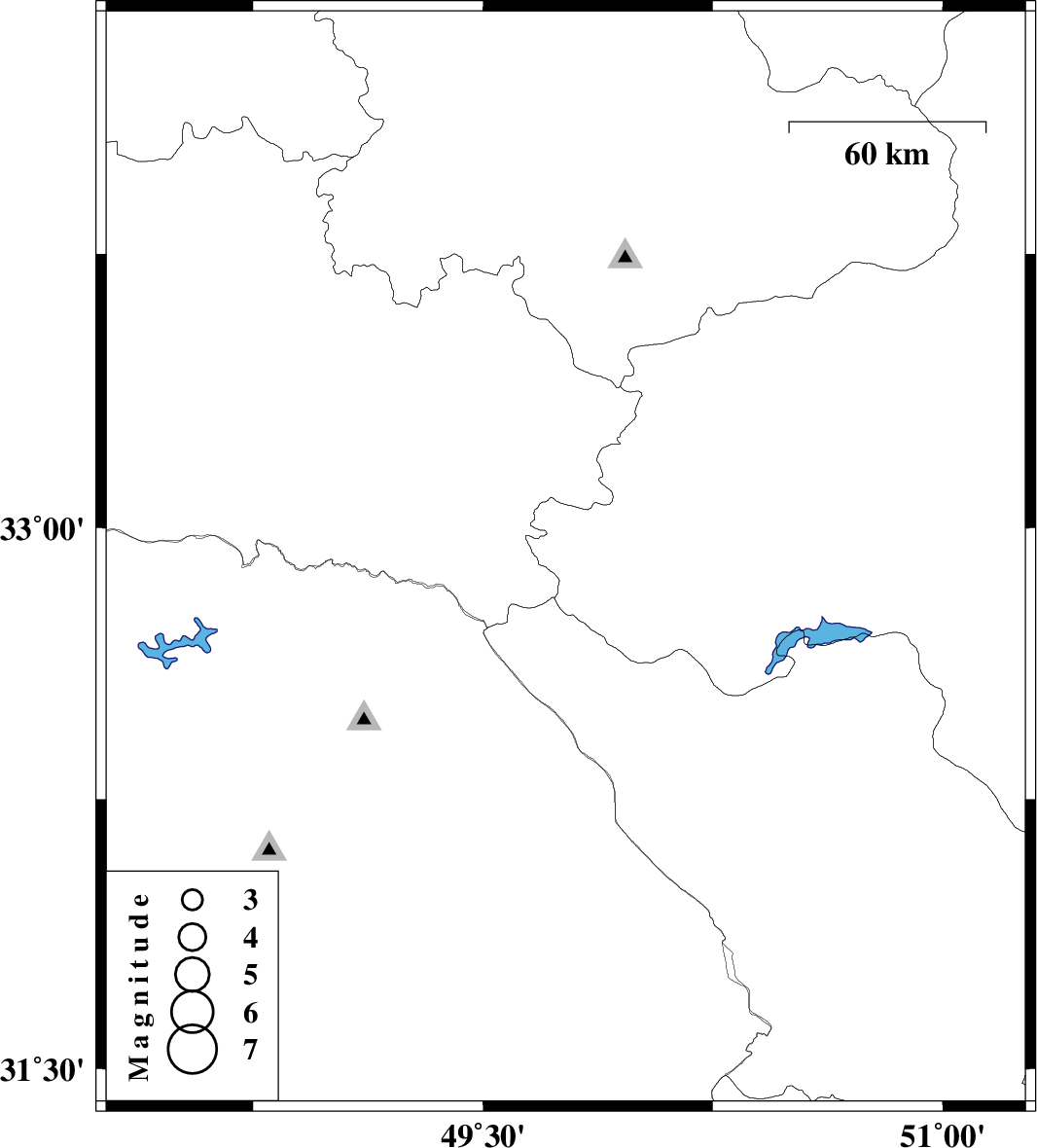 | 2009/09/18 | 23:47:59.1 | 04:17:59.1 | 32.91 | 49.77 | 18 | ML:2.5 | Esfahan Province, 32 km West of Fereydunshahr |