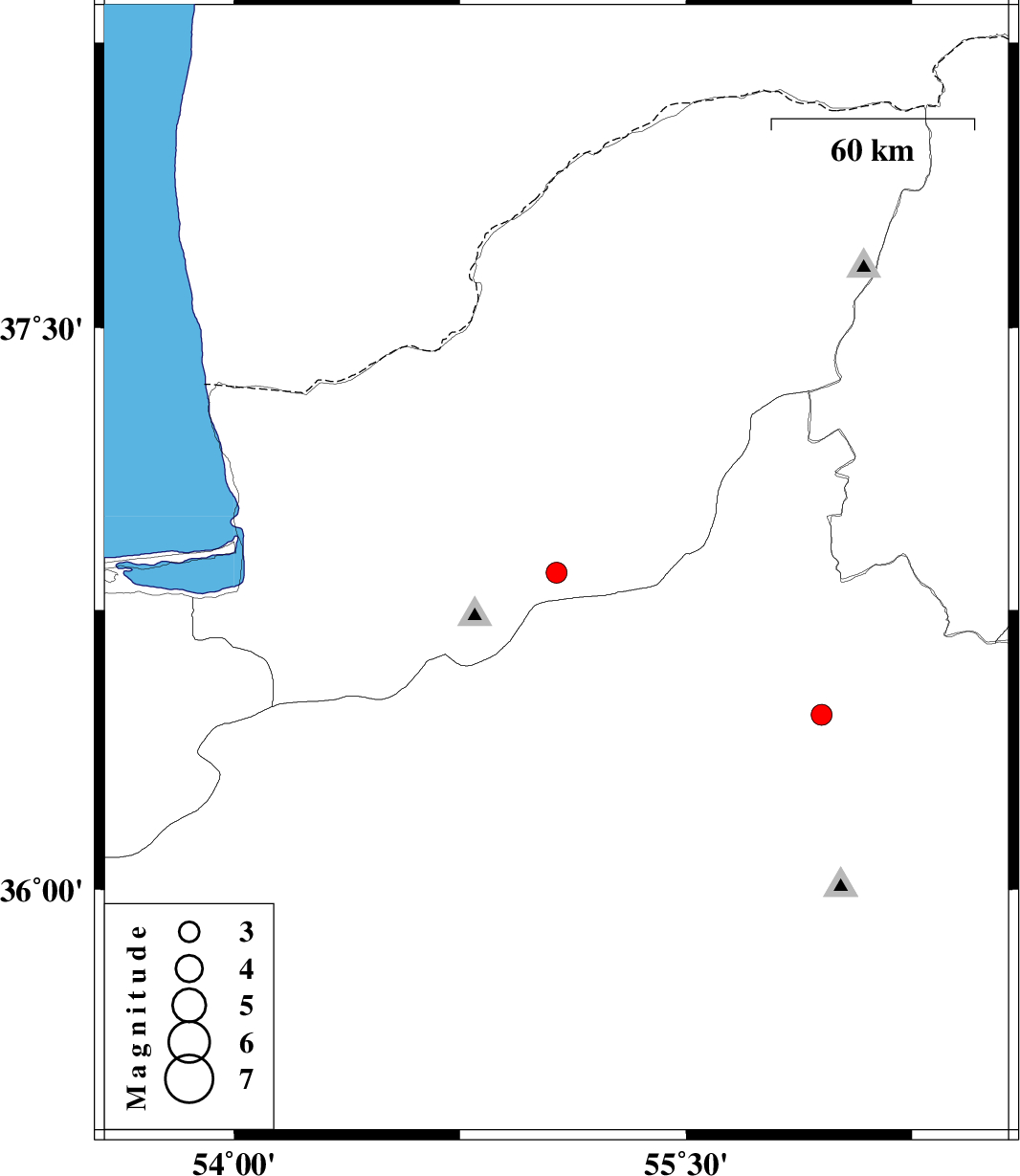 | 2009/09/23 | 02:55:03.4 | 06:25:03.4 | 36.85 | 55.07 | 14 | ML:3.1 | Golestan Province, 19 km South of Ramian | ||