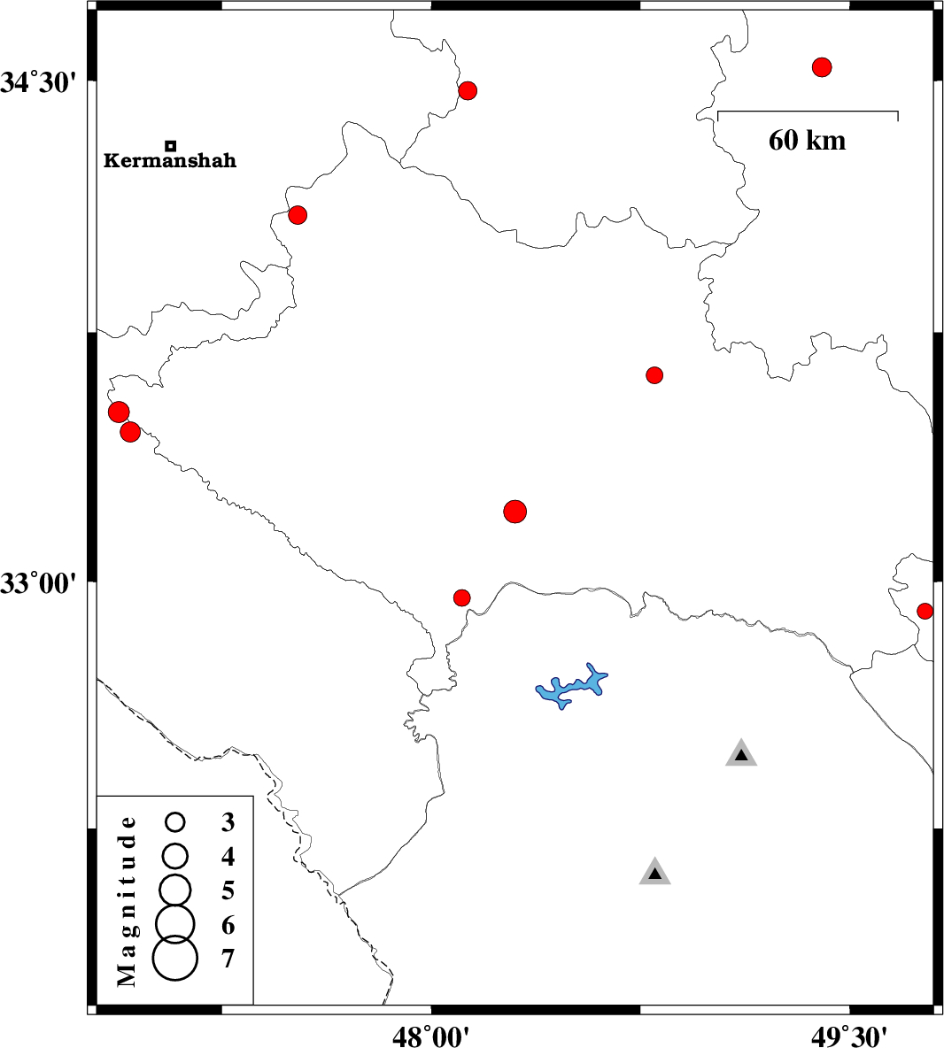 | 2009/08/30 | 09:08:33.8 | 13:38:33.8 | 33.45 | 46.92 | 14 | ML:3.2 | Ilam Province, 50 km South-East of Ilam | ||