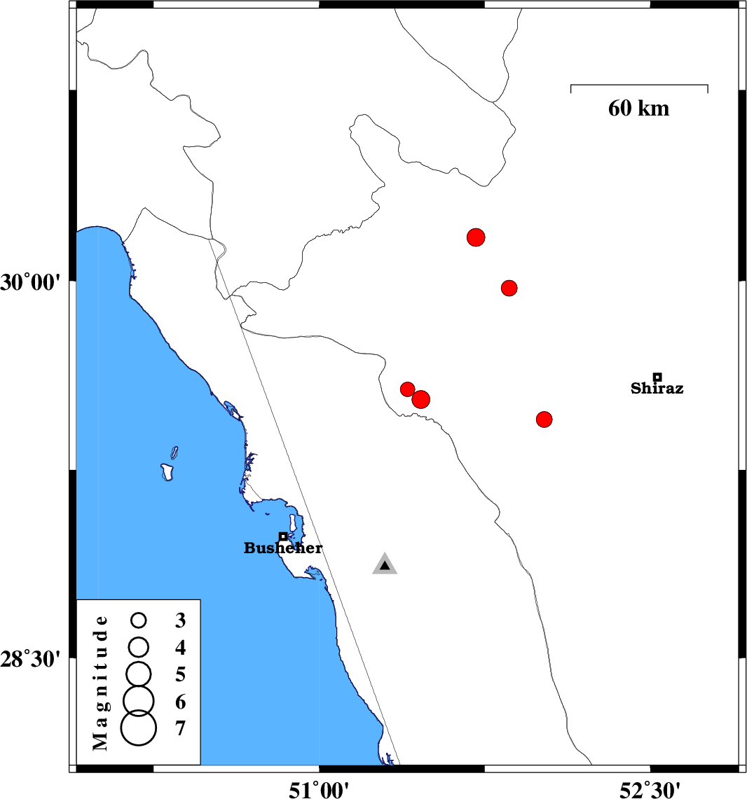 | 2009/09/22 | 06:33:42.9 | 10:03:42.9 | 29.45 | 52.02 | 15 | ML:3.2 | Fars Province, 40 km South-East of Kazerun | ||