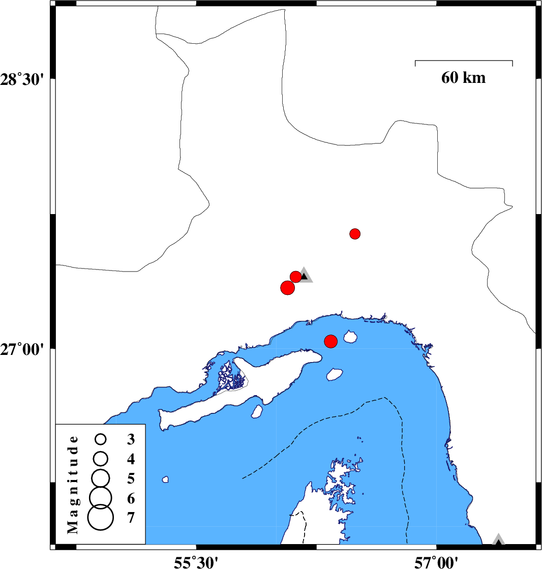 | 2009/09/29 | 05:08:03.7 | 08:38:03.7 | 27.04 | 56.34 | 16 | ML:3.7 | Persian Gulf, 12 km Qeshm | ||