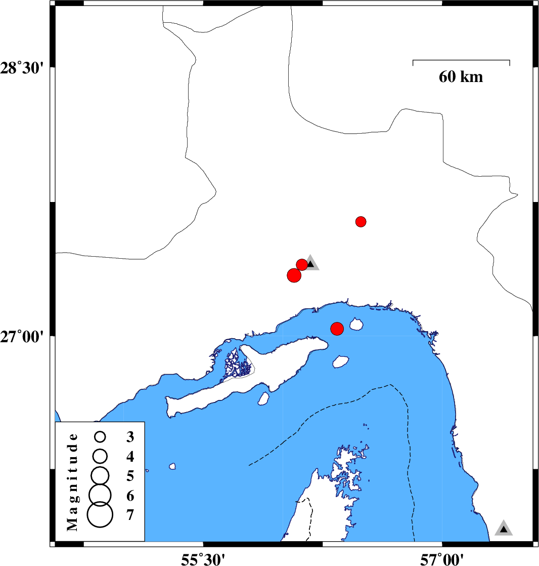 | 2009/09/29 | 05:08:03.7 | 08:38:03.7 | 27.04 | 56.34 | 16 | ML:3.7 | Persian Gulf, 12 km Qeshm | ||
