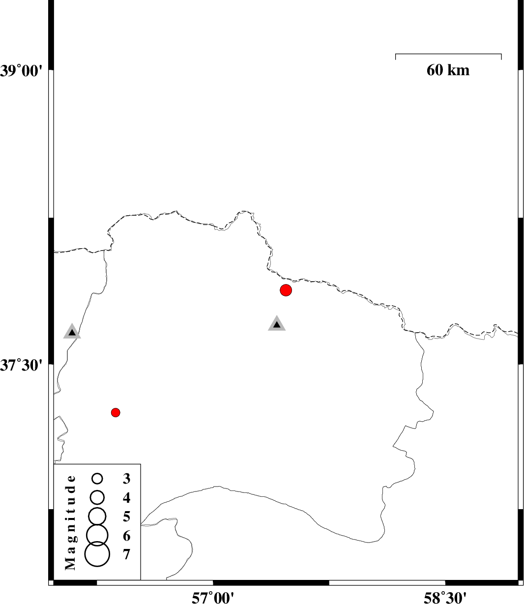 | 2009/09/11 | 20:52:59.7 | 01:22:59.7 | 37.88 | 57.47 | 14 | ML:3.4 | Khorasan(north) Province, 47 km North-East of Bojnurd | ||