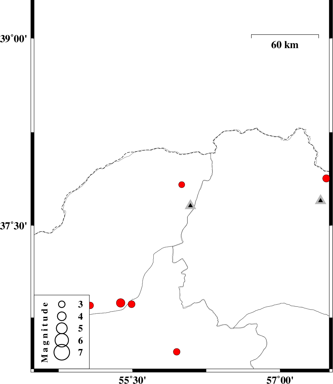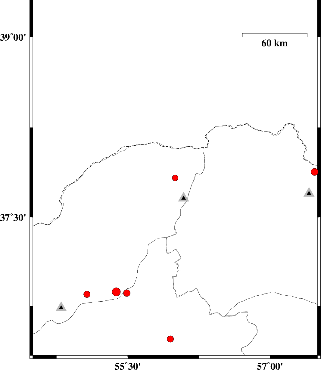 | 2009/09/29 | 06:32:04.5 | 10:02:04.5 | 36.87 | 55.38 | 14 | ML:4 | Golestan Province, 40 km South of Minodasht | ||