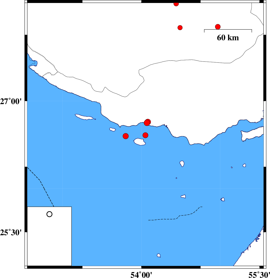 | 2009/09/08 | 08:26:50.4 | 12:56:50.4 | 26.6 | 53.8 | 46 | ML:3.2 | Persian Gulf | ||