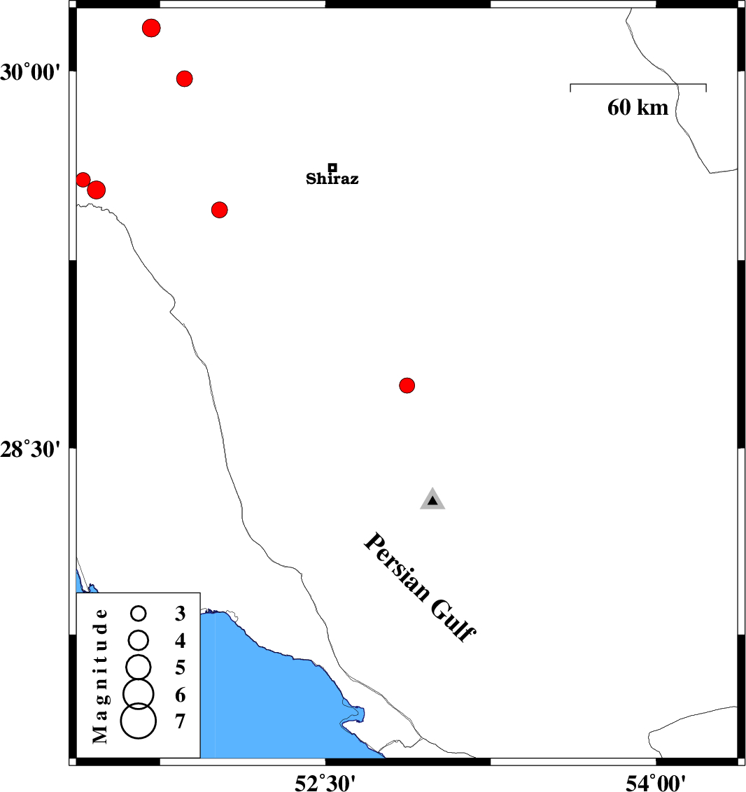 | 2009/09/22 | 06:33:42.9 | 10:03:42.9 | 29.45 | 52.02 | 15 | ML:3.2 | Fars Province, 40 km South-East of Kazerun | ||