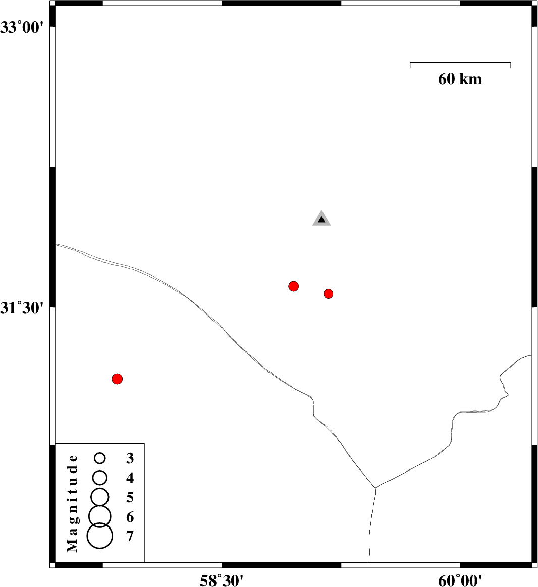 | 2009/10/09 | 02:02:05.2 | 05:32:05.2 | 31.61 | 58.95 | 18 | ML:2.8 | Khorasan(south) Province, 104 km West of Nehbandan | ||