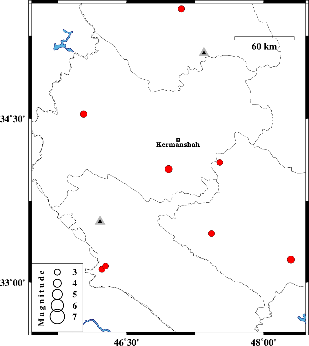 | 2009/10/10 | 11:42:57.3 | 15:12:57.3 | 34.04 | 46.96 | 14 | ML:3.7 | Kermanshah Province, 31 km South-West of Kermanshah | ||