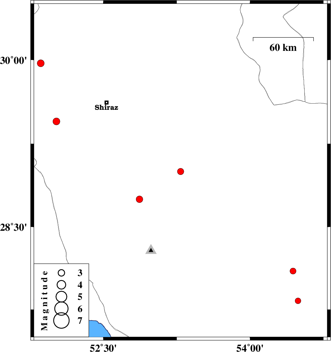 | 2009/09/22 | 06:33:42.9 | 10:03:42.9 | 29.45 | 52.02 | 15 | ML:3.2 | Fars Province, 40 km South-East of Kazerun |