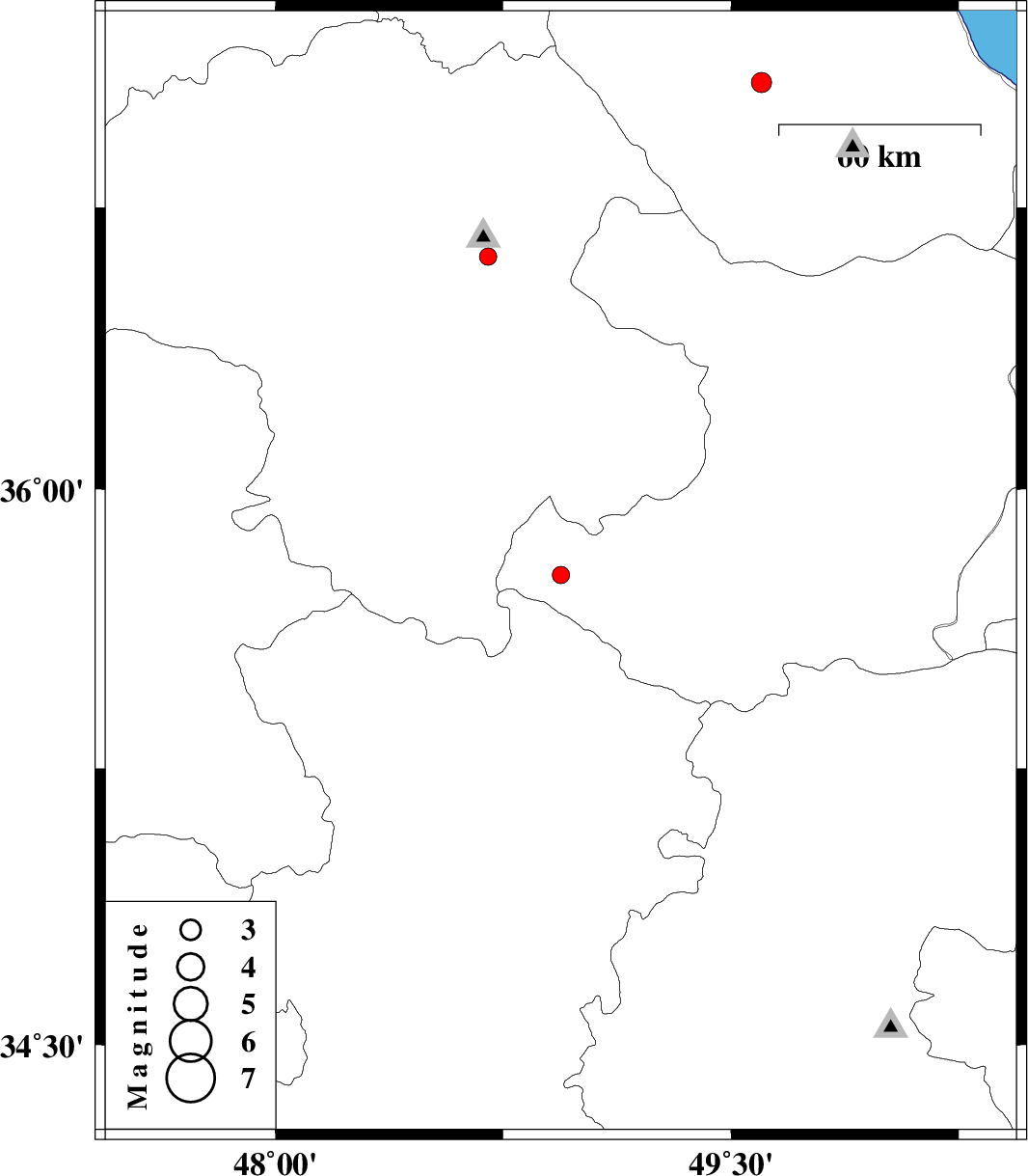 | 2009/10/12 | 15:38:31.6 | 19:08:31.6 | 35.77 | 48.94 | 15 | ML:2.5 | Ghazvin Province, 44 km North of Razan | ||