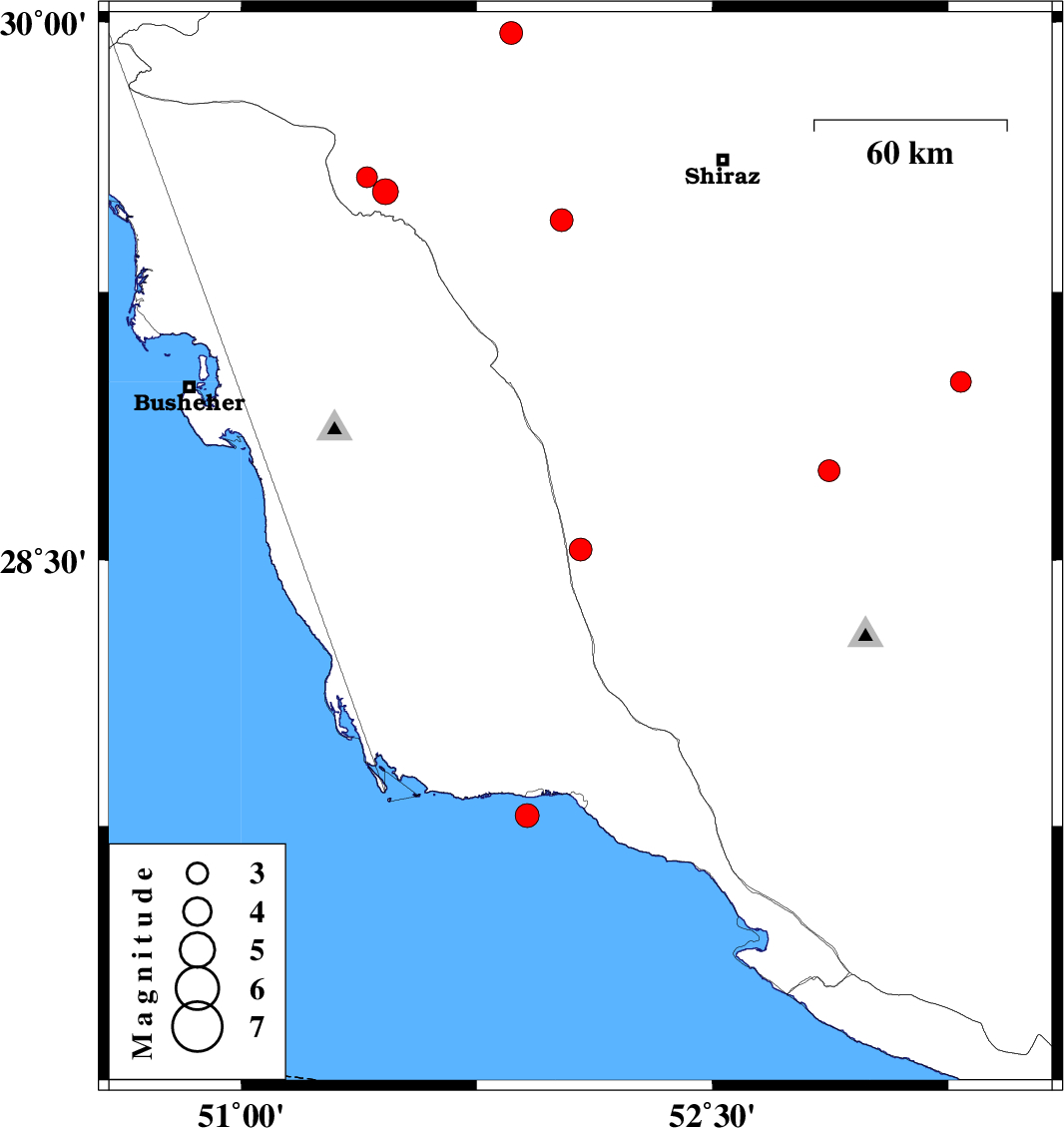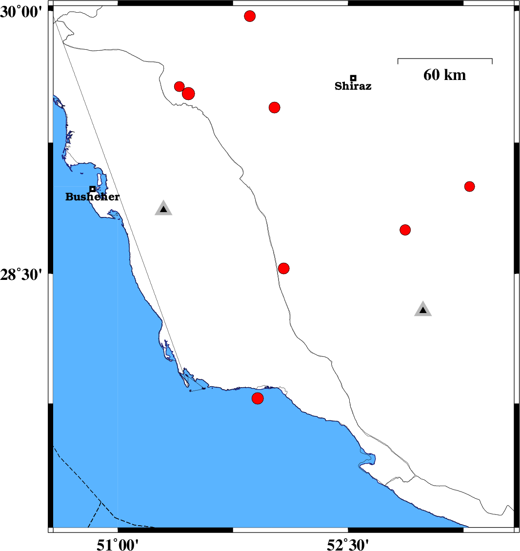| 2009/09/22 | 06:33:42.9 | 10:03:42.9 | 29.45 | 52.02 | 15 | ML:3.2 | Fars Province, 40 km South-East of Kazerun |
